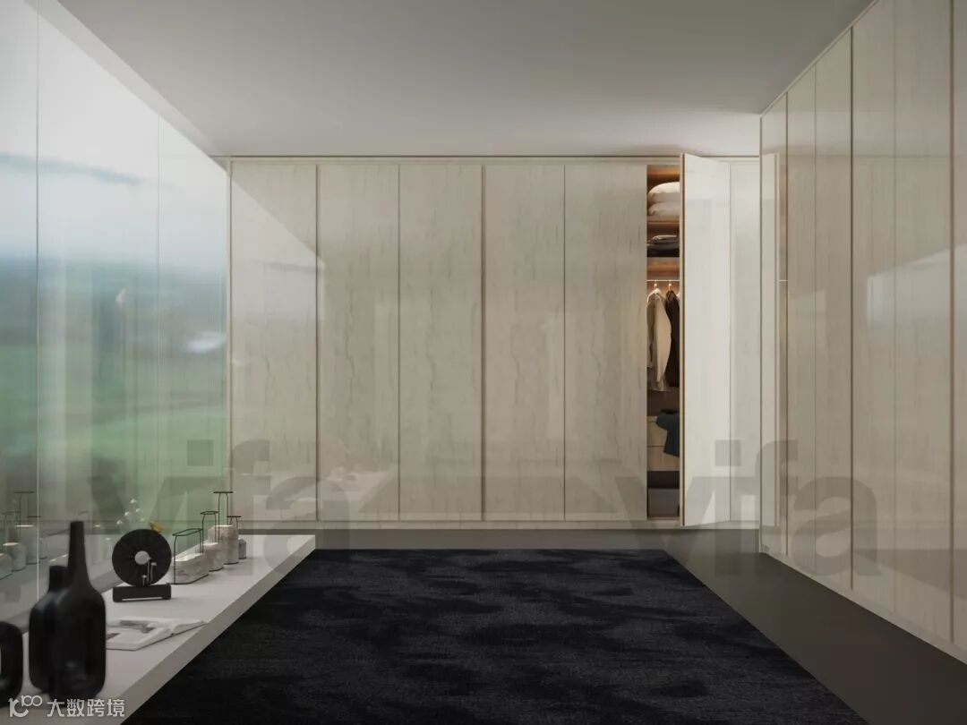 在这个项目的主人房设计中,统一选用了赫尔辛基的设计,纯白洁净,门型设计简洁利落,表面木纹自然细腻有质感。为了让空间更通透,在入门过道的衣柜设计中,我们融入了玻璃门的设计。磨砂玻璃和清玻元素交错点缀,立体别致,极具设计感。