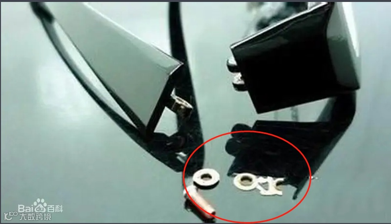 4、观察铰链结合。纯钛镜架在铰链部位不宜使钛与钛直接接触,否则易出现接合处发皱、镜腿张合不畅的现象。通常在纯钛镜的铰链部位镶嵌两枚薄薄的垫片,将上下铰链分割开来。因此,检查铰链处有无垫片,也是鉴别是否是纯钛镜架的很好方法。从镜架内侧观察铰链结合处,会发现有一小凹槽,这是便于将垫片取出的专门设计。