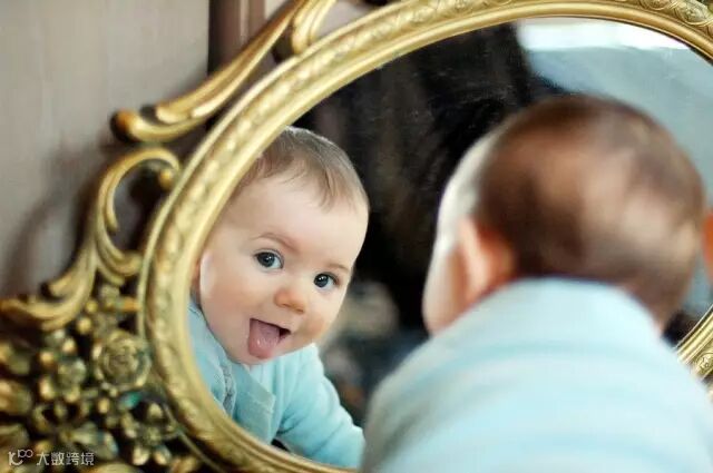 一开始可以把小镜子悬挂在婴儿床上,让躺在床里的宝宝自己琢磨琢磨。等宝宝可以抓住东西后,让TA自己拿着镜子玩。哈哈,总有一天TA会发现镜子里的人就是TA自己。