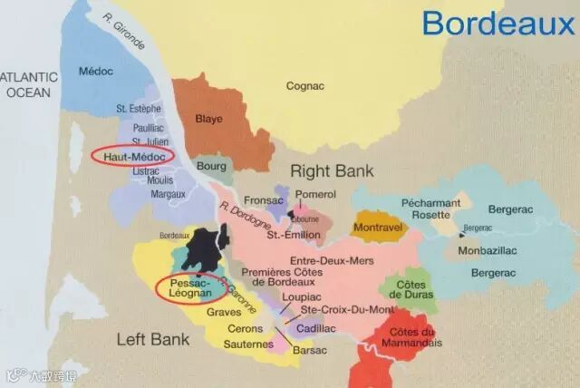 我们都知道波尔多左岸(特别是梅多克地区Medoc)以生产赤霞珠而闻名。梅多克地区有包括上梅多克和下梅多克(Bas-Medoc),其中下梅多克(通常简称为梅多克,在酒标上也会标注为“Medoc”)生产的葡萄酒品质较为一般,真正优质葡萄酒集中在上梅多克。虽然赤霞珠在下梅多克和格拉夫地区 (Graves)是很重要的葡萄品种,但只有在上梅多克地区,该品种才占绝对的主导性地位。在上梅多克出产的高端葡萄酒里,赤霞珠的比例可以占到 3/4。波尔多另一个优质赤霞珠产区是隶属于格拉夫的佩萨克-雷奥良(Pessac-Leognan)。