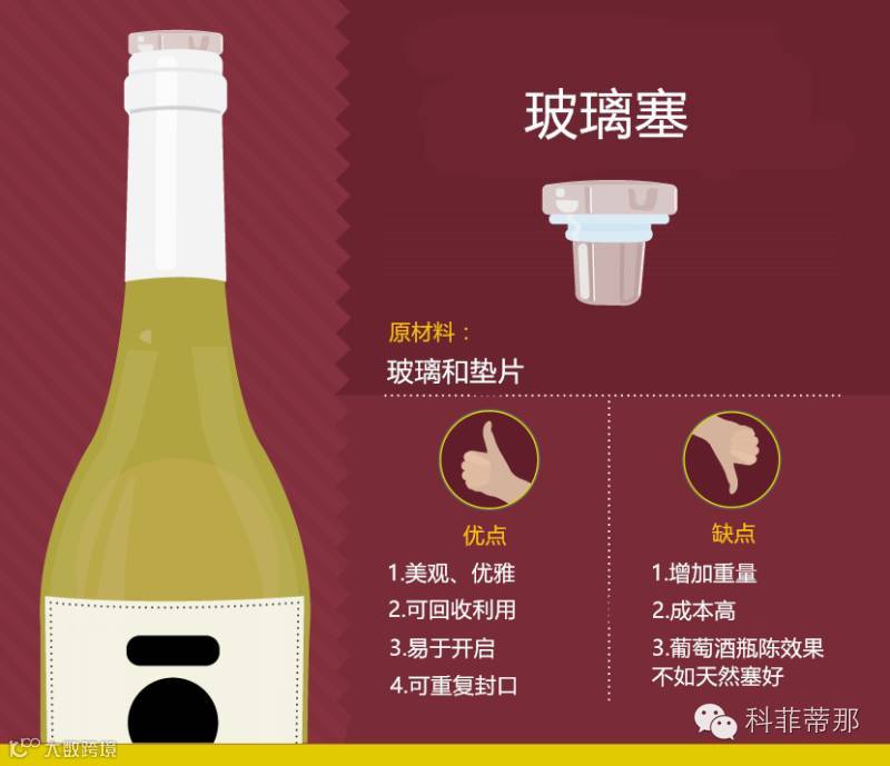 尽管玻璃塞在美国没有被广泛采用,但这种瓶塞在欧洲部分地区很受欢迎,如德国和奥地利。这种玻璃塞十分美观,可回收利用,而且能有效防止葡萄酒氧化。另外,如果一瓶葡萄酒开瓶后还没饮用完,只需把玻璃塞重新盖上即可,十分方便。这种瓶塞的缺点是,给葡萄酒增添一定的重量,且成本较高。