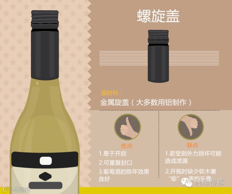 上世纪70年代,一些酒商深受软木塞污染的困扰,开始尝试用螺旋盖来封瓶。采用螺旋盖封瓶的葡萄酒无需任何开瓶器便能轻松开启。这种瓶塞不存在木塞污染,且温度和湿度的变化几乎不会给螺旋盖带来任何影响。如果一瓶葡萄酒开瓶后还没饮用完,只需重新盖上螺旋盖即可。另外,使用螺旋盖封瓶的葡萄酒在存放的时候不需要水平放置,许多葡萄酒还能在瓶中很好地陈年。
