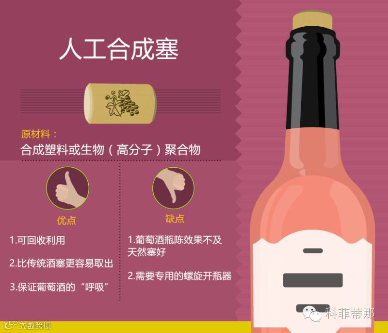 人工合成塞通常是采用合成塑料制品制成的。这种瓶塞是可回收利用的,在外形上和功能上与天然塞相似,都能保证葡萄酒的“呼吸”。一些著名的生产商,如诺马科(Nomacorc)还推出了采用甘蔗聚合物制成的合成塞。而说到这种瓶塞的不足之处,除了依然需要专门的开瓶器,还有一点是,葡萄酒在瓶中陈年的效果不如天然塞好。
