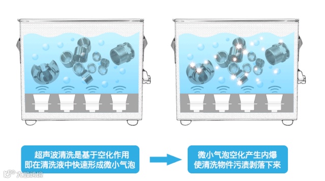 空化作用就是超声波以每秒两万次以上的压缩力和减压力交互性的高频变换方式向液体进行透射。在减压力作用时,液体中产生真空核群泡的现象,在压缩力作用时,真空核群泡受压力压碎时产生强大的冲击力,由此剥离被清洗物表面的污垢,从而达到精密洗净目的。