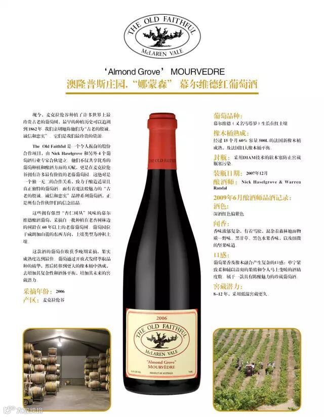 “澳隆普斯庄园”有五个葡萄种植园:科菲地(Café Block)、娜蒙森(Almond Grove)、纳斯坡(North Exposure)、桑德丘(Sandhill)和托普峰(Top of the Hills),葡萄种植历史可追索到19世纪60年代,园内植株多为超过80年以上树龄老藤。酒庄也因此而命名为THE OLD FAITHFUL,意译为“古老的殷诚、诚信和忠实”,以表达酒庄创始人RICHARD HASELGROVE对这片古老土地和长青古藤的尊重和传承。
