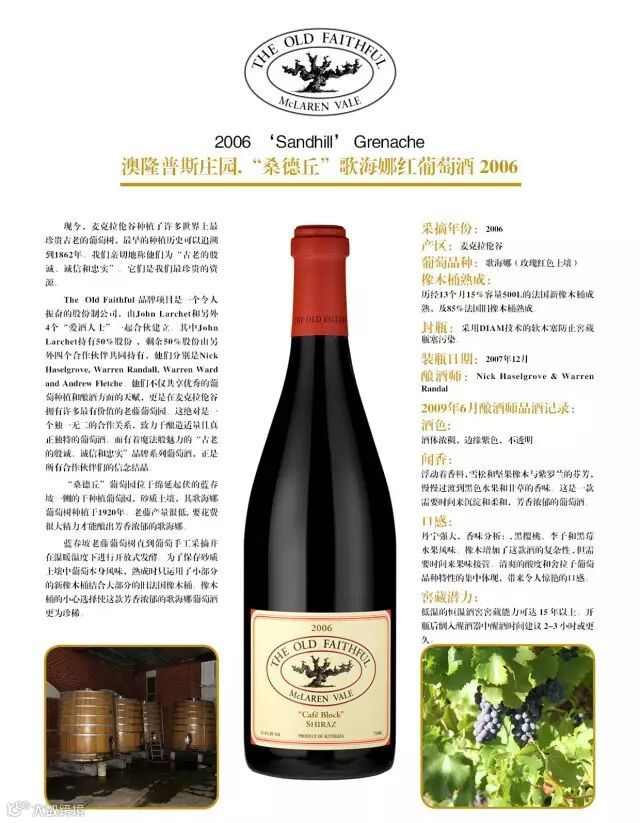 “澳隆普斯庄园”创立前,这五个葡萄园果实的经常买家包括澳大利亚最顶级的品牌,尤其是“科菲地葡萄园(Café Block)”的神果,更是用来酿造奔富格兰许(Penfolds Grange)、哈迪艾琳哈迪西拉(Hardys Eillen Hardys Shiraz)、玫瑰山巴尔默勒尔西拉(Rosemount Balmoral Shiraz)等世界葡萄酒界最有影响力的新世界旗舰葡萄酒。现今“奥隆普斯庄园”的酿酒生产基地始建于1970年,致力于用传统和现代酿酒工艺相结合的方式来雕琢葡萄酒。首席酿酒师尼克,是澳大利亚酿酒经历遍布于四大洲的知名飞行酿酒师,无论是法国波尔多和朗格多克,还是在西班牙里奥哈,还是在美国加州纳帕,还是在智力库尔瓜查,还是在新西兰,都能发现尼克佳酿的足迹。尼克在2012年迎来他的第40个酿酒年份之际,被全澳历史最长的葡萄酒专业媒体《WINESTATE》评为“2012年度澳大利亚最佳年度酿酒师”,近年来“澳隆普斯庄园”在罗伯特.帕克《葡萄酒倡导者》盲品中连续获得90分以上高分,无疑再次佐证“澳隆普斯庄园”品质的出众性和稳定性,“澳隆普斯”已成为“麦克拉伦谷葡萄酒行业”在国际市场正名的代表性酒庄。