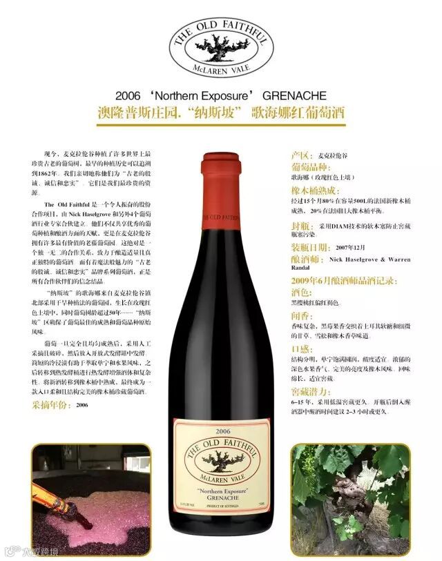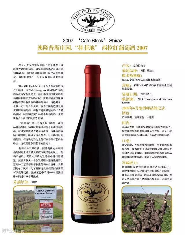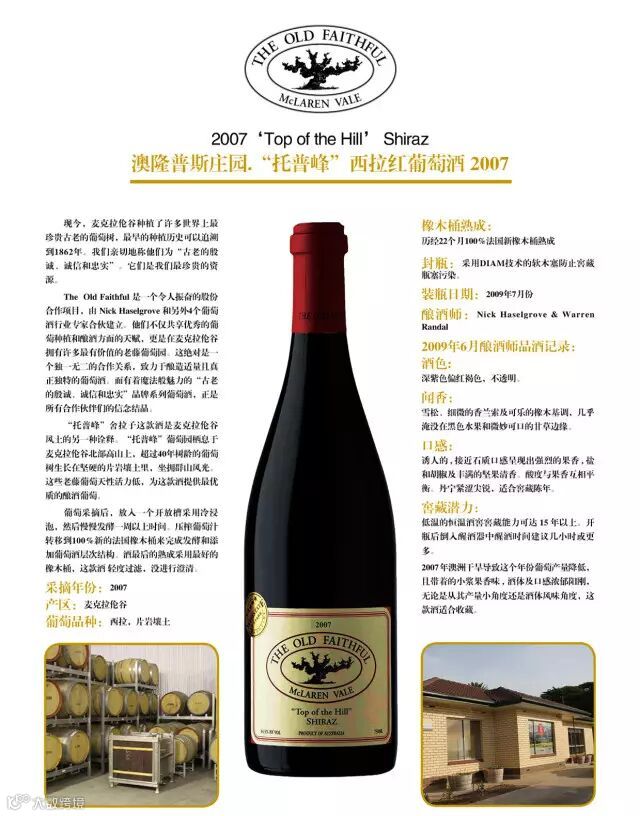 “澳隆普斯庄园”(曾用名:老藤庄园/古藤庄园)”位列JAMES HALLIDAYS分级“五颗红星级”,位于南澳洲最古老的葡萄酒产区之一麦克拉伦谷,风景优美如画,位于洛夫蒂山(Mount Lofty)与文森特海湾(St Vincent)的白沙滩群之间。由于受到附近海洋的降温调节影响,麦克拉伦产区内存在多种气候形态,但“澳隆普斯庄园”五个葡萄园的气候形态呈典型地中海气候。澳隆普斯几个葡萄园海拔差异较大,使得几个品种的葡萄酒不拘一格。