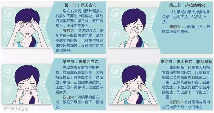 不定时的按摩眼眶,前额和脸颊。当眼睛因为长时间看近距离,肌肉会紧绷,借由放松脸部和头部的肌肉,眼睛肌肉也会放松。闭上眼睛轻轻的按摩眼睫毛,这也会放松眼睛,再眨眼睛时也会轻松。