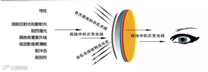 通常,阳光是向四面八方照射的,当射到物体上时,光线重新定向反射出来,形成水平及垂直两种反射光,前者就是造成目眩的乱反射光,这是影响视线的无用偏光。偏光镜片采用和隐形眼镜一样轻巧精密的合成树脂制成。薄薄的镜片,事实上是七层薄片合成的。最外面两层是超硬的耐磨层,第二、六层是防碎强化层;第三、五层是紫外线过滤层;最中间一层是偏光过滤层,整体构造精密独特,经测试,能滤除99%刺眼乱反射光,96%有害紫外线,并具防碎、防磨特殊功能。一般有色玻璃片或塑胶片所无法克服的反射偏光,在通过此种偏光过滤镜片时,即被黑晶体的百叶窗式结构所滤掉,剩下有用的垂直光线进入眼睛,感觉就舒适而清楚了。