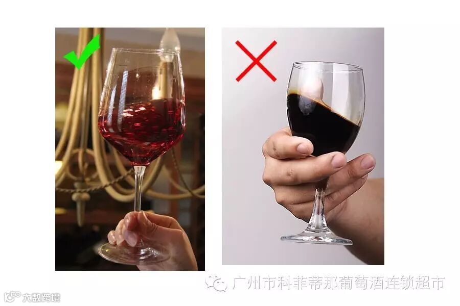 别以为用手捧着杯肚最稳当,其实错了。因为手掌的温度会令杯中的酒开始升温,进而影响到葡萄酒中风味物质的散发。应该用大拇指和食指、中指捏住杯托,也可以捏住杯肚和杯底中间的杯柱。