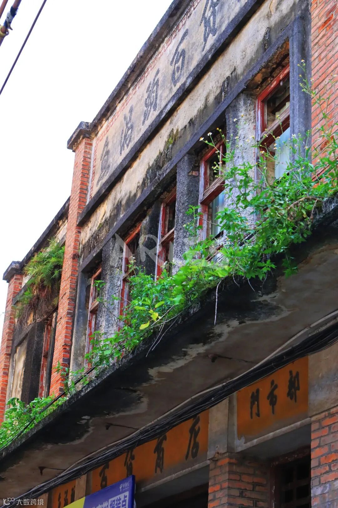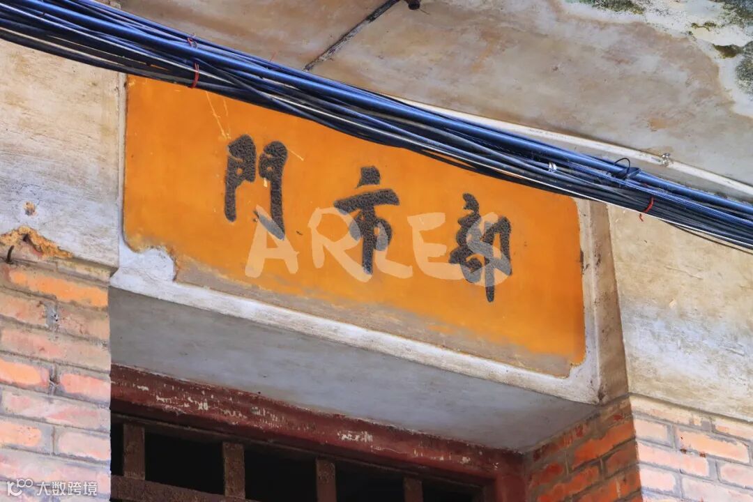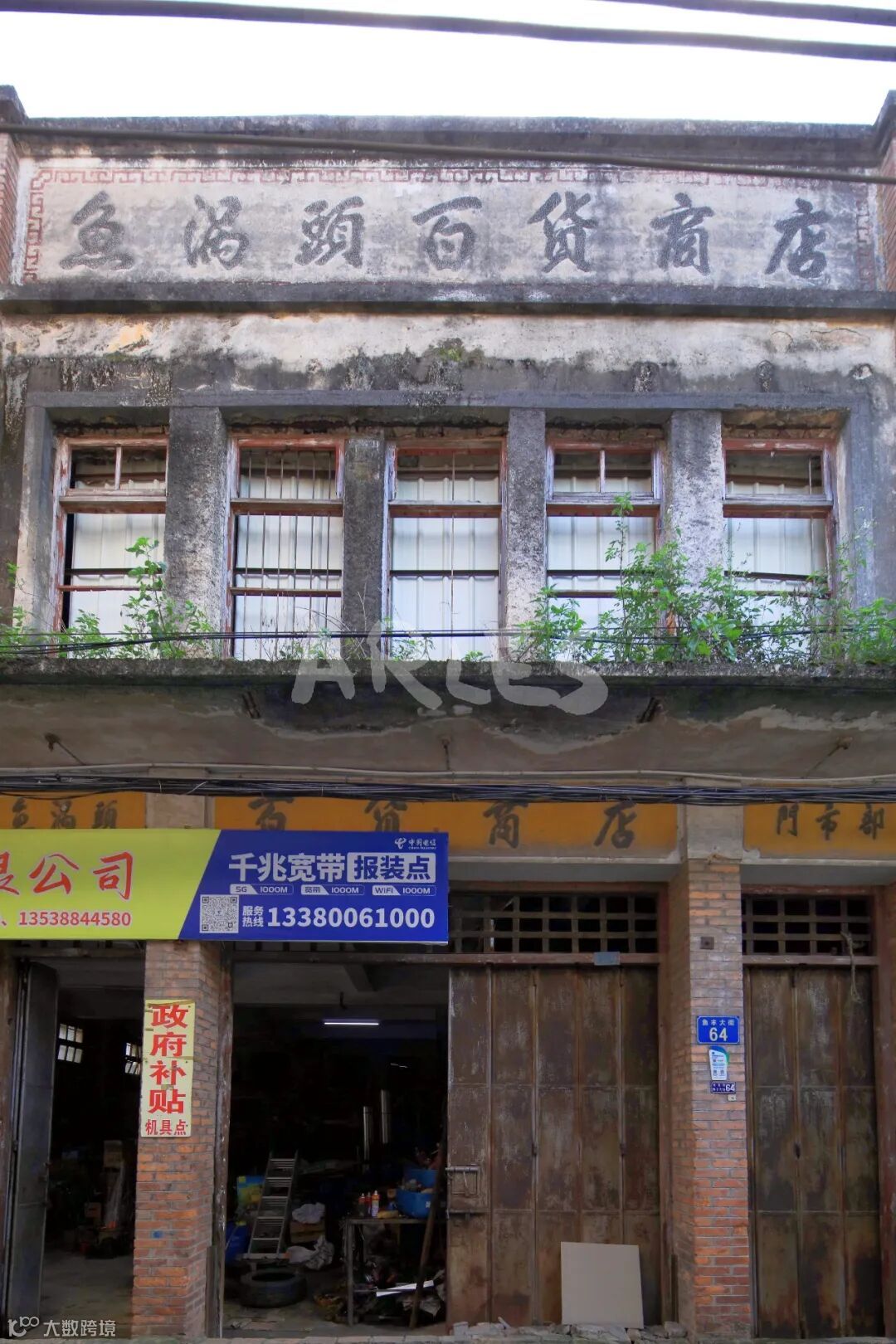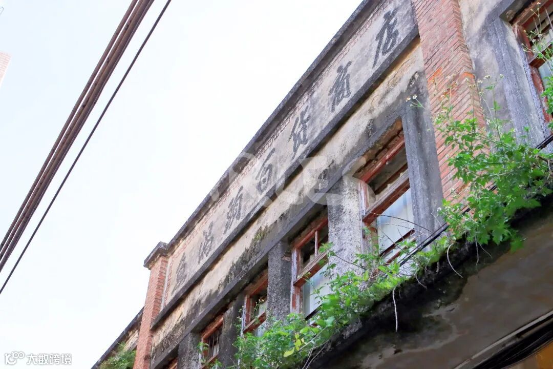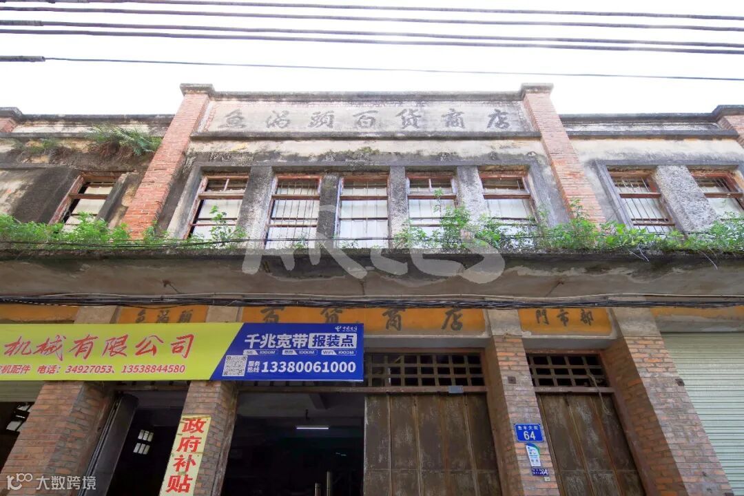 它是典型的民国至建国初期岭南工商业建筑,红砖立柱撑起硬朗的骨架,灰砂墙面被岁月磨得斑驳,人字形坡屋顶的檐角还留着当年的利落线条。二层多格木窗带着铁栅栏防护,既通风又防盗,是那个年代最实用的设计;门楣上方,“鱼窝头百货商店”的繁体阴刻字依旧清晰,厚重的字体里藏着老墟市的烟火气。