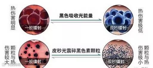 传统镭射是以热能破坏黑色素,会造成伤口甚至反黑,现在皮秒镭射是运用755nm镭射,高速在皮肤上产生冲撞与压力,震碎黑色素,黑色素经由代谢排出,伤口。皮秒镭射透过蜂巢瞬效透镜,将镭射光重新分配,还可以促进胶原蛋白增生,治疗毛孔·细纹。