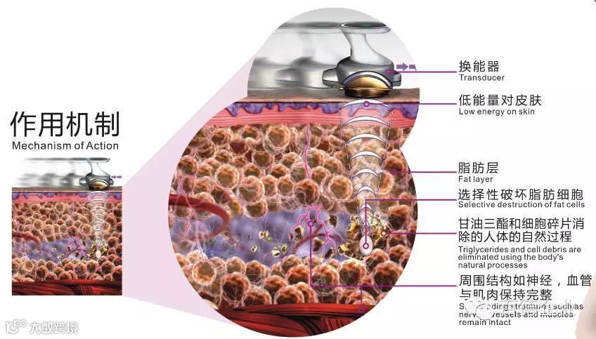 2.选择性:只会破坏脂肪细胞,周围重要的结构,如血管、神经或是肌肉组织仍是完整无缺的,因此不会有副作用。