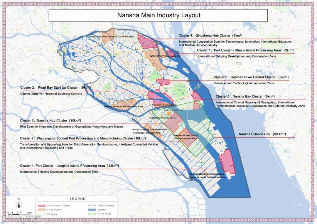 南沙湾区块·广州滨海国际门户、国际科技创新合作和文化创意区 | 5km²:以粤港澳现代服务业及国际科技创新紧密合作与融合发展为主导,重点发展科技创新、文化创意、商务会展、服务外包、航运服务总部、邮轮游艇经济等功能,聚焦海洋科学等国家重大战略和基础工程,打造粤港澳大湾区科技创新高地。