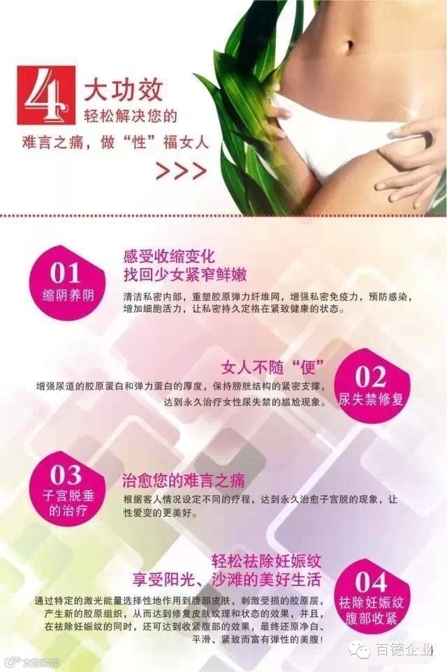 德国钻石饵激光采用德国Fotona欧洲之星专利技术的Smooth无创模式铒激光来治疗,深度可控制在200-500um,,温度可控制在50-70度,在精确温控及深控条件下,调节参数变化,实现胶原蛋白收缩、重组及再生目的,最终达到阴道收紧、治疗压力性尿失禁、轻中度子宫脱垂和祛除妊娠纹、腹部收紧。根据国外的临床数据显示,德国钻石饵激光在这四大方面具有卓越的临床疗效,且安全性一直维持在较高水平,远远优于其他CO2激光。