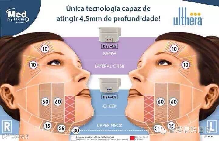 源自美国最新的Ulthera超声刀一次美肤,实现紧肤、除皱、塑形三大完美功效。Ulthera超声刀先进之处是采用最先进的超音波能量,深层穿透,能够深至SMAS层,产生近万个凝结点,令胶原蛋白产生立即的收缩和刺激胶原大量新生和重组,构建全新的胶原蛋白纤维网,从而从皮肤底层给肌肤增强弹性。轻松的抚平皱纹,使松弛的肌肤立即的紧实起来,你会发现肌肤立即的紧致年轻很多,饱满富有光泽,触感柔嫩富有弹性