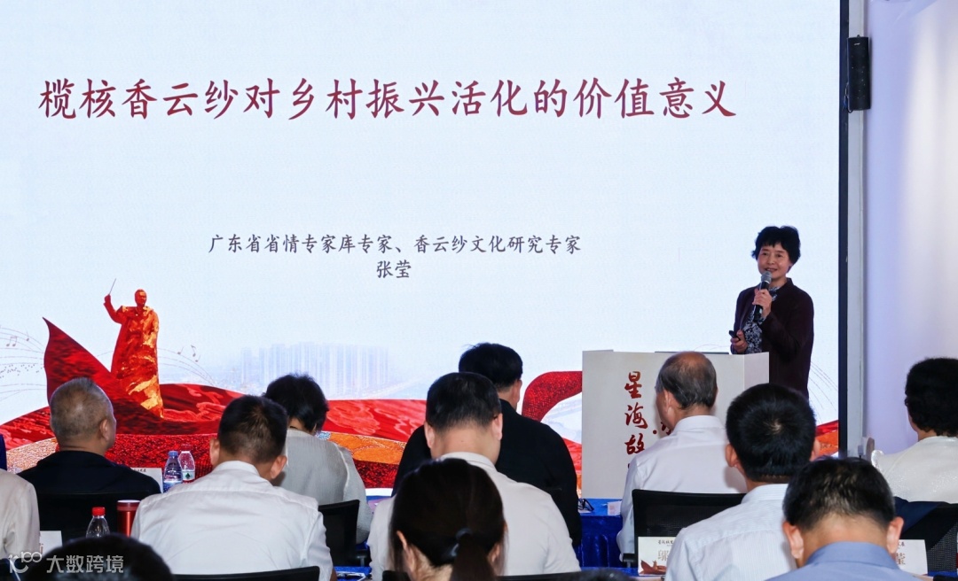 今年4月,广东省省情专家库专家、香云纱文化研究专家张莹在榄核文脉研讨会议上亦讲述了:香云纱,正名为“莨纱”,是源自广东的一种独特丝绸制品。其名称的演变形象地反映了它的物理特性:据1860年《华英通语》记载,其最初名为“响云纱”;至1868年,《三编清代稿钞本》中的《物意管窥》一篇已使用“香云纱”之名。另据《广东省志·丝绸志》等文献记载,该织物以桑蚕土丝为原料,采用“扭眼通花”(即绞纱罗组织所形成的镂空提花)的纱罗结构织成。因穿着时面料摩擦会发出沙沙声响,故初得名“响云纱”,后取其谐音,雅称为“香云纱”。