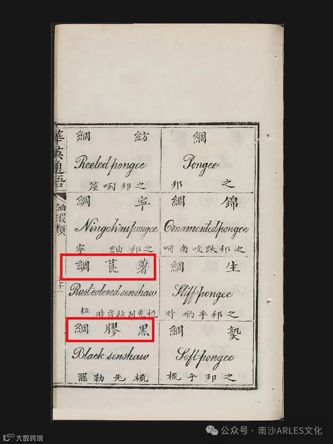 ▲1860年《华英通语》“薯莨绸、黑胶绸”的记载