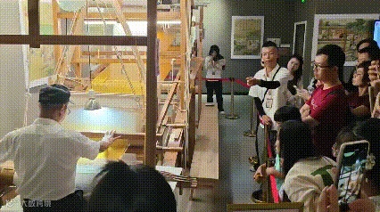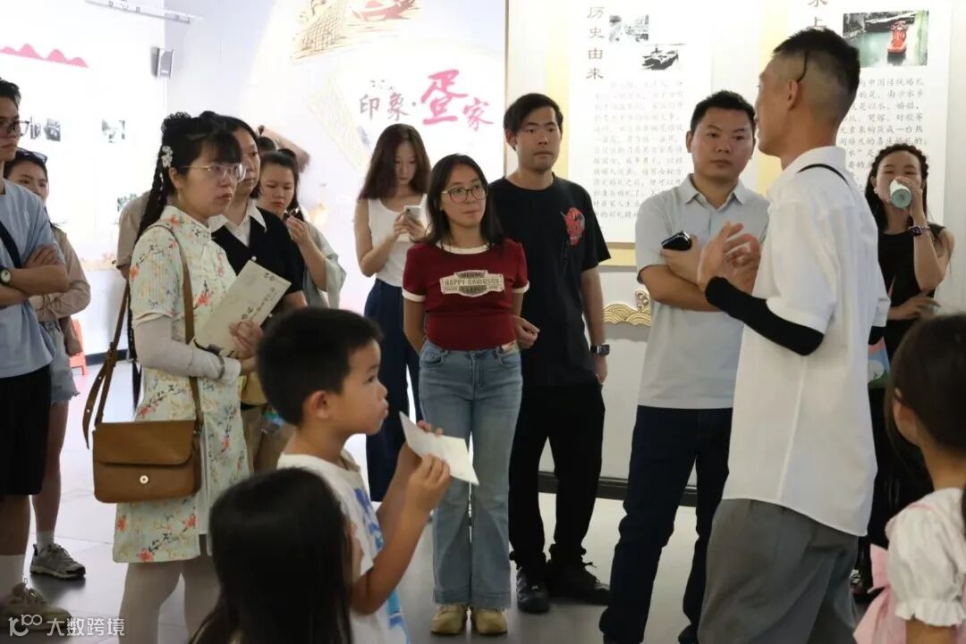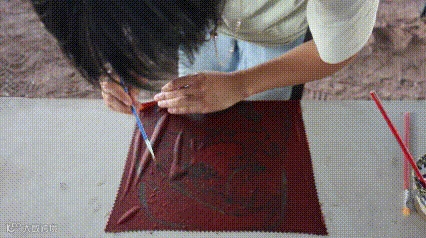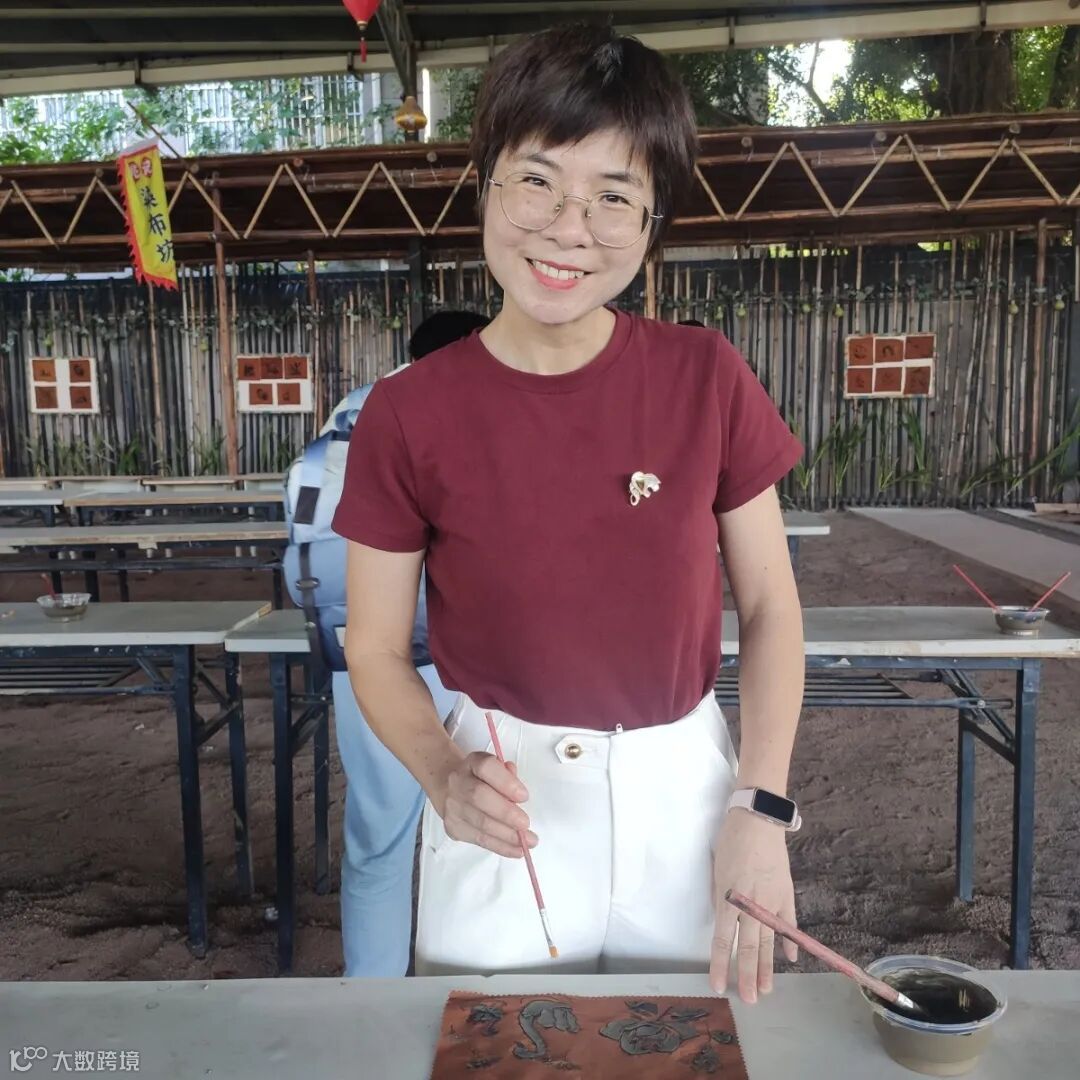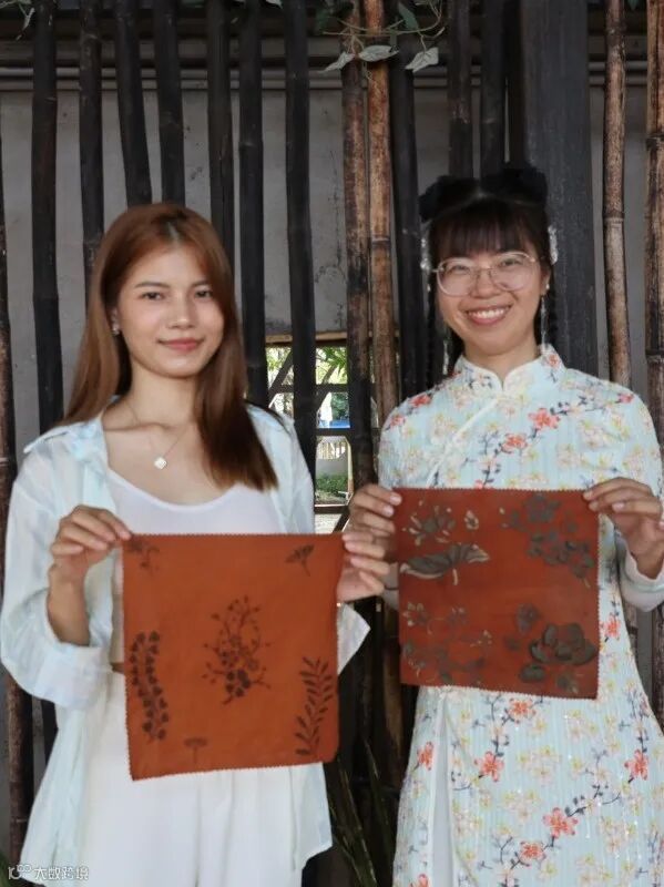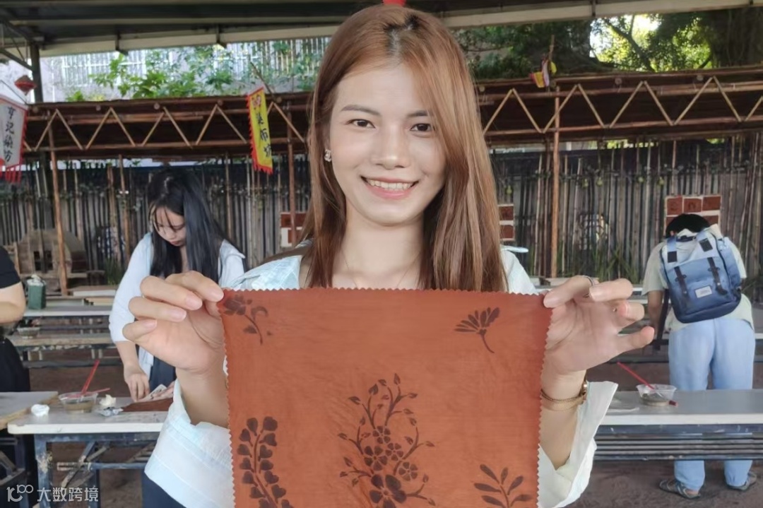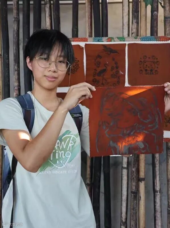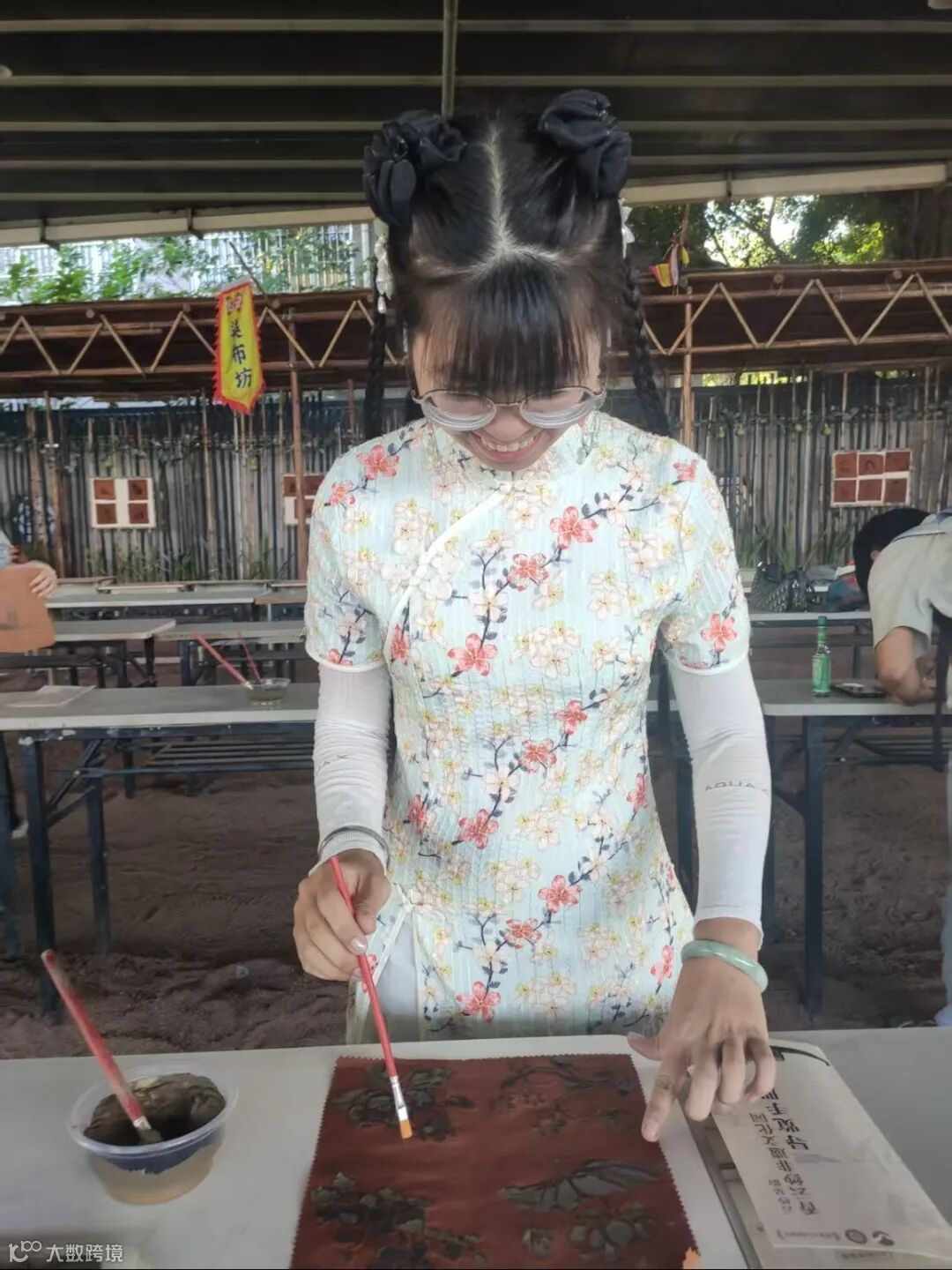 最令人期待的当属过乌拓印体验环节。在专业的香云纱老师指导下,大家手持拓印板,蘸取河泥,在浸染过薯莨汁的方巾上细细涂绘。几分钟的等待里,肉眼可见的颜色变化悄然发生,原本浅棕的织物上渐渐浮现出古朴雅致的乌色纹路。“哇!好好看啊!”大家的作品各有千秋,一幅幅作品令人惊叹连连~