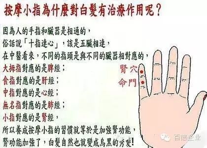 因为小拇指与肾有密切的联系,按摩小拇指可以强肾,中医认为“肾者,其华在发。”头发的营养虽然来源于血,但头发的生机,根源于肾气。