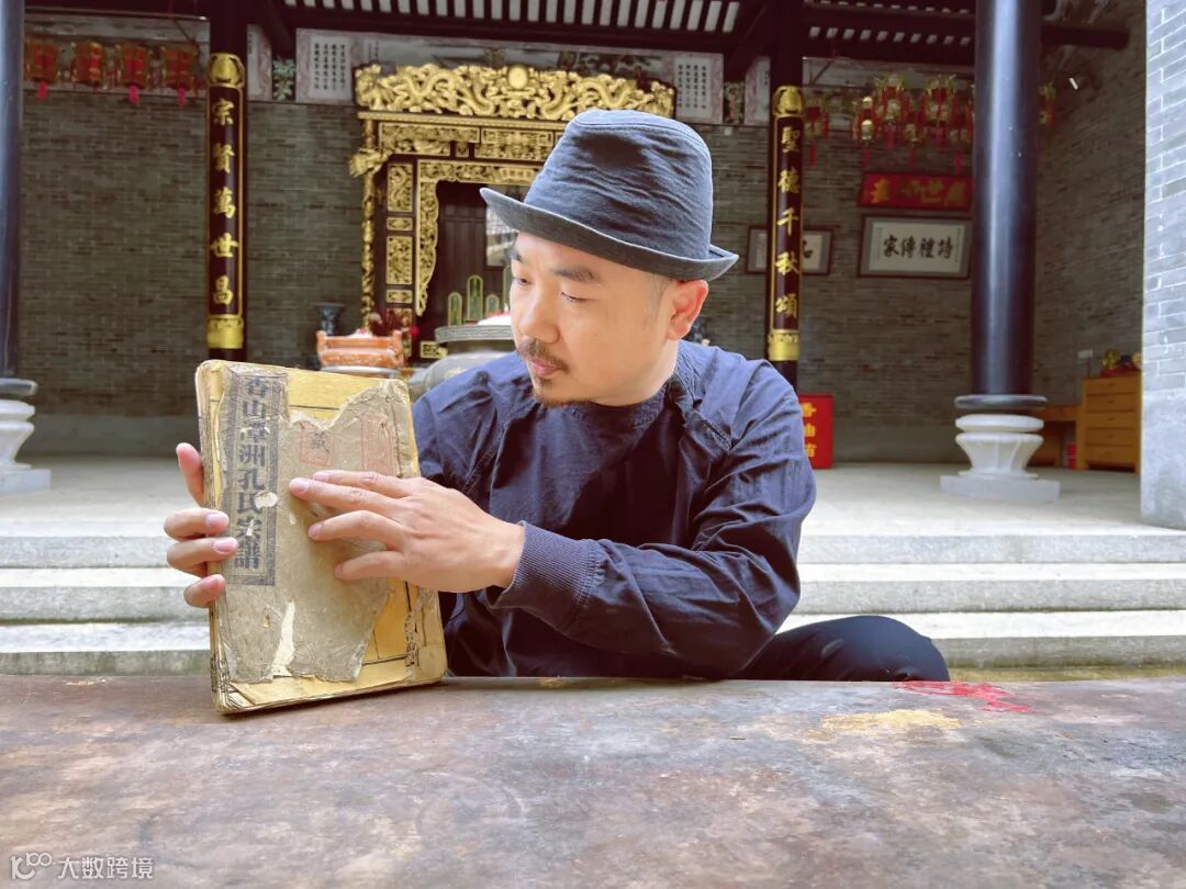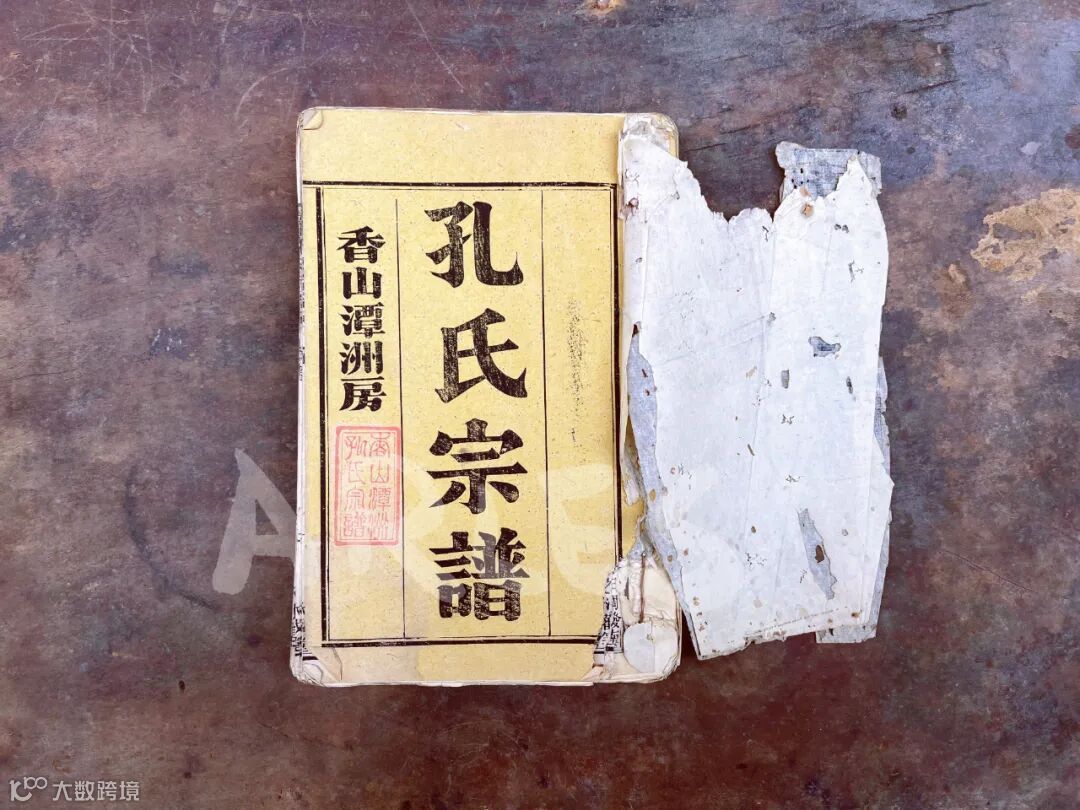 孔家祠现任族长孔昭窝先生展示了珍贵的《香山潭洲孔氏宗谱》(已有数百年历史)。宗谱记载关键信息: