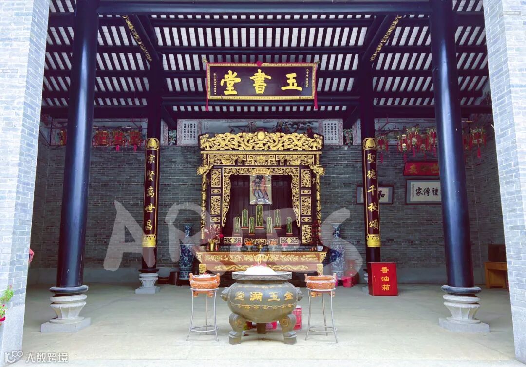 祭祀中心: 重建的孔家祠内,“玉书堂”供奉孔子画像及岭东孔氏先人牌位,居中者为村中先祖孔公宽(明代孔子第58代孙)之位。