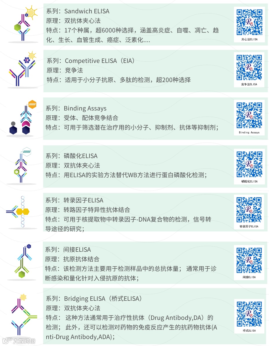 RayBiotech ELISA总动员!全线6折!炎症、趋化、自噬、凋亡、血管生成、生殖、周期、凋亡相关,通路研究,抑制剂筛选,抗体检测应有尽有!扫码了解详细产品。