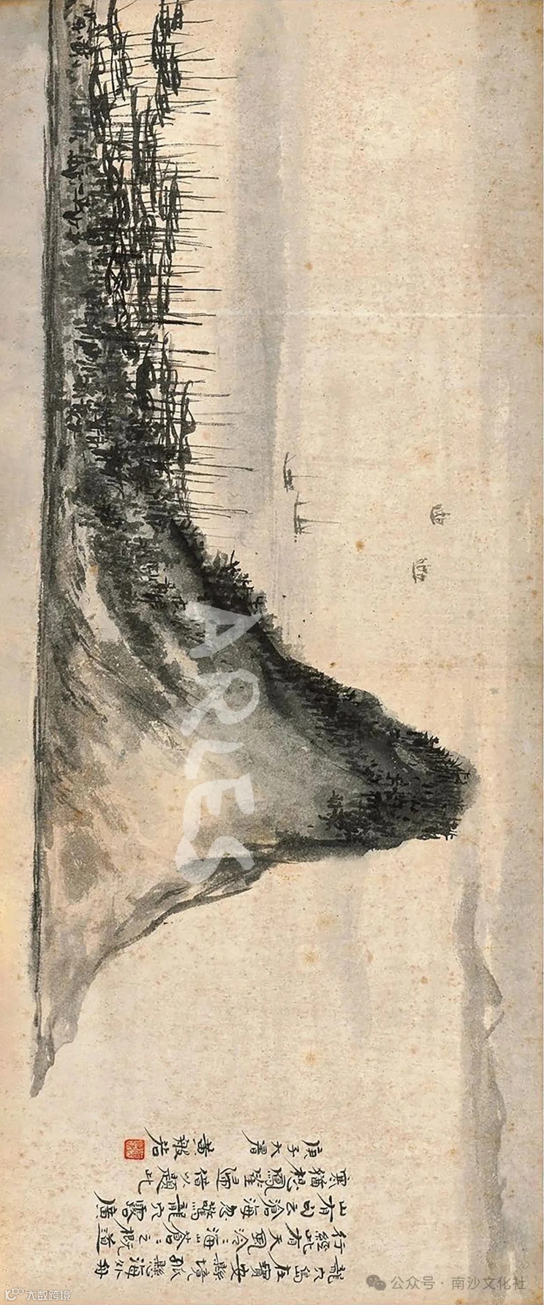 龙穴岛的奇景历来是文人墨客吟咏的对象。清康熙九年,新安县令李可成便作《龙穴楼台》诗赞颂其海市幻境。2021年,广州艺术博物院“万千世界——黄般若艺术回顾展”中,展出了大师描绘龙穴岛的作品。黄般若在画上题字,引古人诗句“沧海忽惊龙穴露,广寒犹想凤笙归”,生动传递了龙穴岛“孤悬海外”所引发的“天风泠泠、海山苍苍”之苍茫意境。