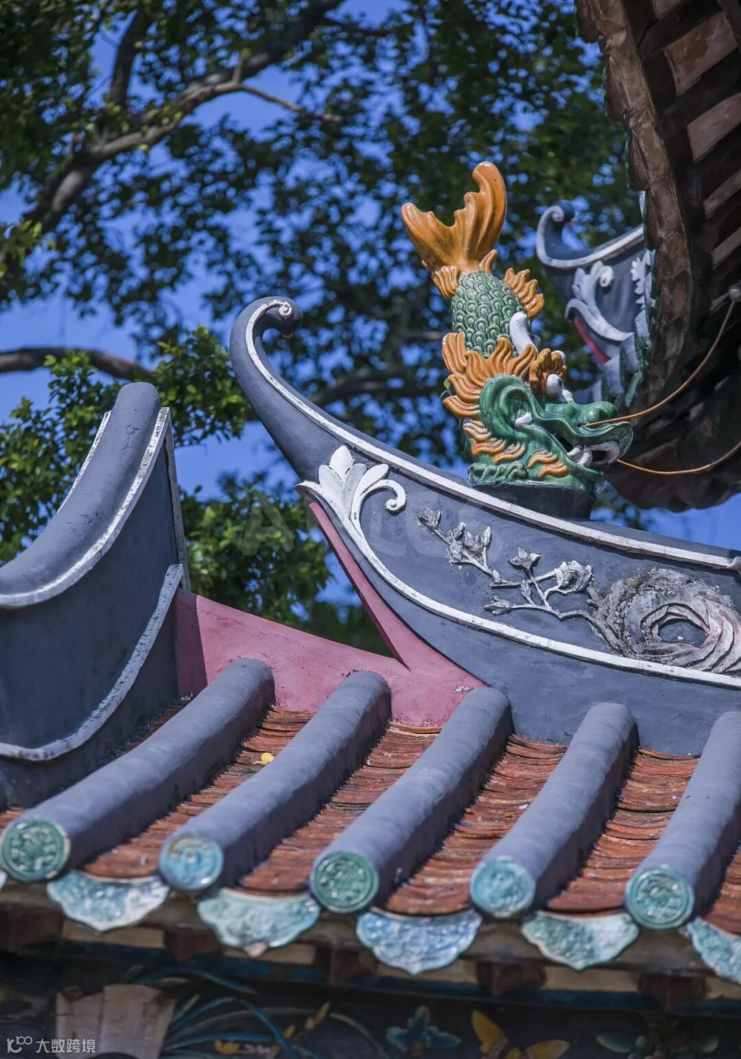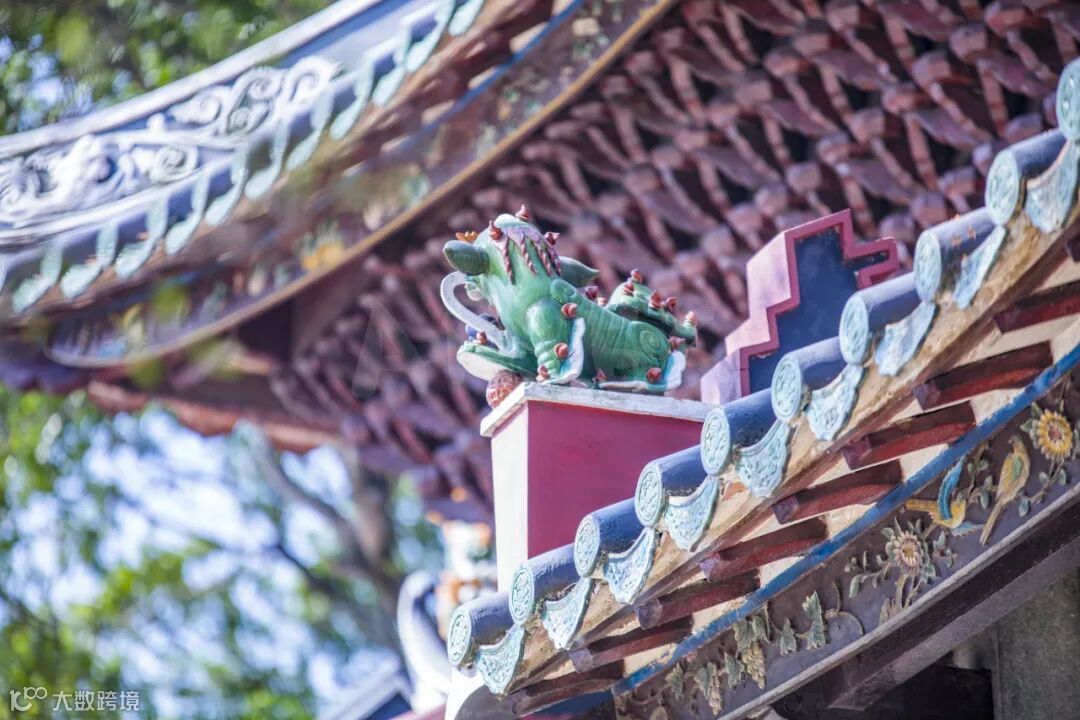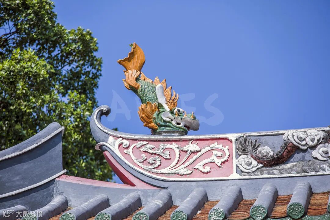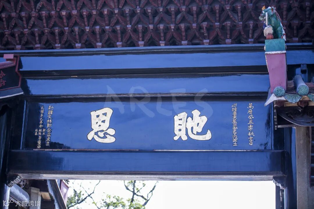 余屋进士牌坊坐东向西,高8米,占地面积约45平方米,采用罕见的十二柱三间三楼石结构,歇山顶设计彰显官式建筑的庄严气象。其最引人注目的是精湛的建筑工艺——施如意斗拱承重展现力学之美,碌灰筒瓦与绿琉璃瓦当、滴水剪边形成典雅的色彩对比。正脊上的鳌鱼吻饰象征着"独占鳌头"的科举理想,檐下密集的斗拱层叠出结构的韵律美感。明间前后分别嵌有"进士"、"赐恩"木匾,笔力遒劲,彰显着牌坊的双重旌表主题。这些建筑元素不仅具有极高的艺术价值,更是一套完整的视觉符号系统,无声地传达着科举成名的荣耀、皇恩浩荡的荣宠以及光宗耀祖的家族观念。