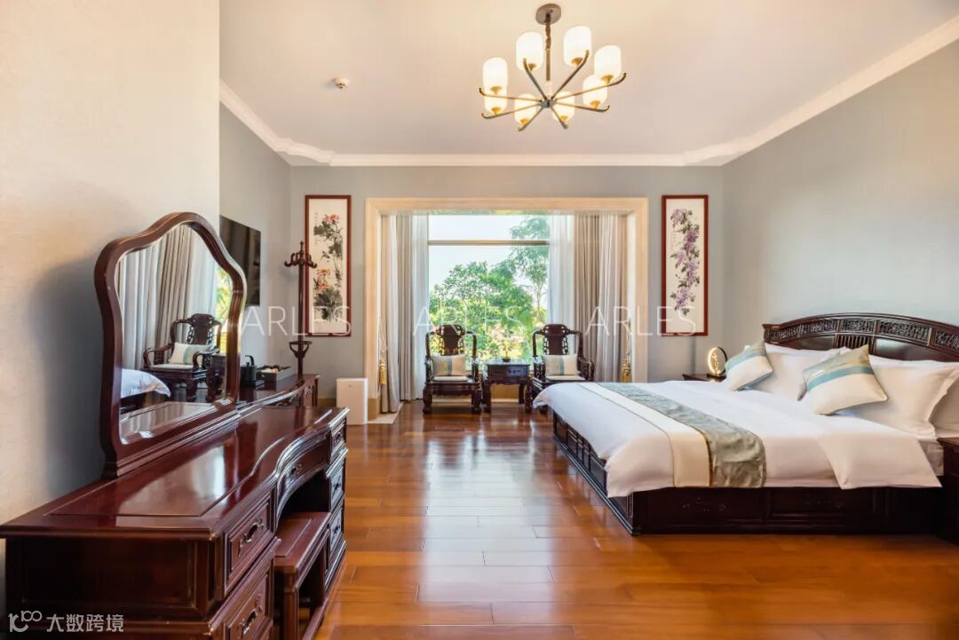十六间房舍各有芳名,却共拥同一份诗意:“临畔江景房”独占视野C位——晨起推窗,江水裹挟晨雾漫入眼帘,白鹭掠过稻田的身影被中式窗棂框成动态画卷;“欢乐花园房”被芭蕉与绣球簇拥,绿意从落地窗蔓延至床头;“田园房”的木梁散发泥土清香,夜晚躺平听虫鸣与水流合奏催眠曲。