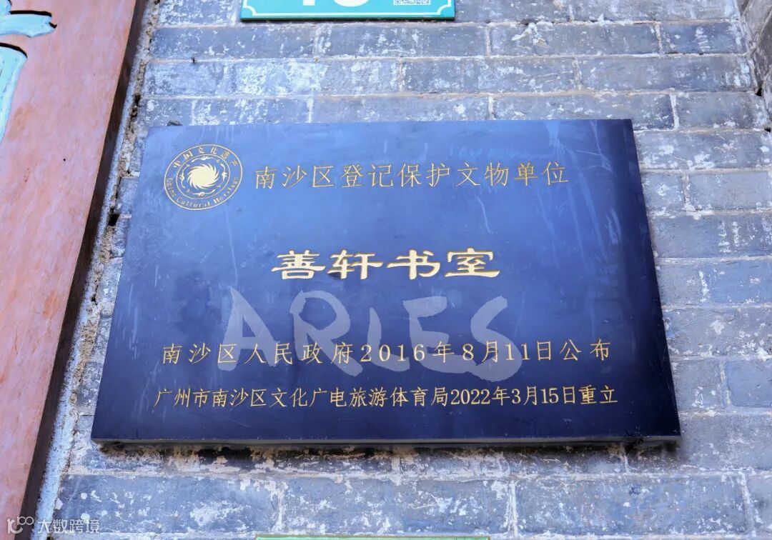 善轩书室始建于明末,清代重修,位于塘坑村塘坑中街43号。这座古建筑坐北向南,规模为三间三进,建筑面积约270平方米。其建筑特色鲜明,包括人字封火山墙、碌灰筒瓦、青砖墙、红砂岩石脚、灰塑龙船脊(头门)、凹斗门以及花岗岩石门夹等。内部结构包含铺石天井、卷棚顶廊、方身红砂岩石柱,封檐板雕刻着精美的花草人物图案。后堂原悬挂的“积庆堂”木匾现已不存。作为南沙现仅存的三间古代书舍之一,它于2013年被公布为南沙区登记保护文物单位。