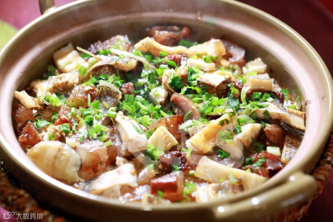 风鳝腊味煲仔饭是山海交融的杰作——风鳝干的丰腴油脂在猛火催逼下深情拥抱每一粒米饭,鱼腊的醇厚鲜甜与稻香缱绻交融,香、甜、咸、滑在口中奏响交响。