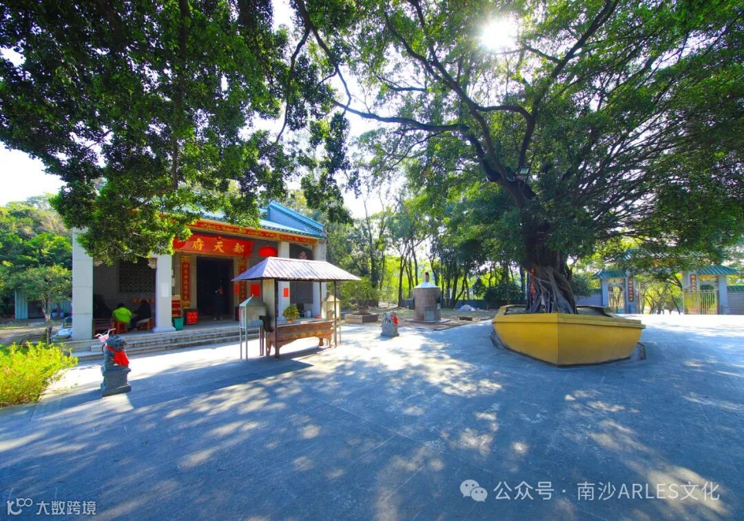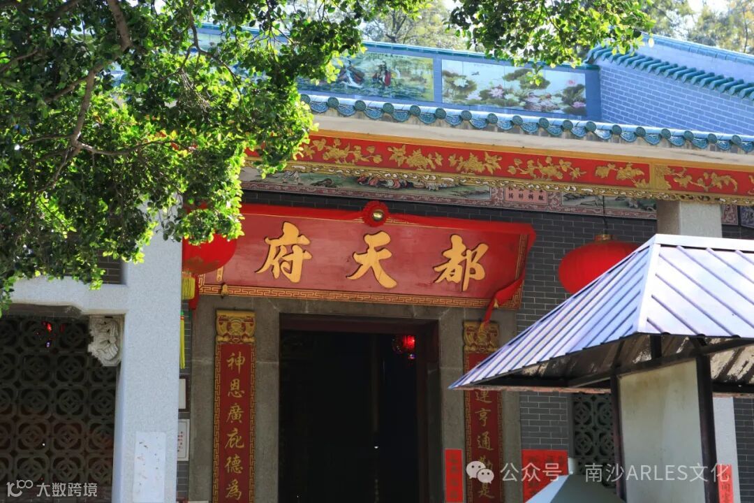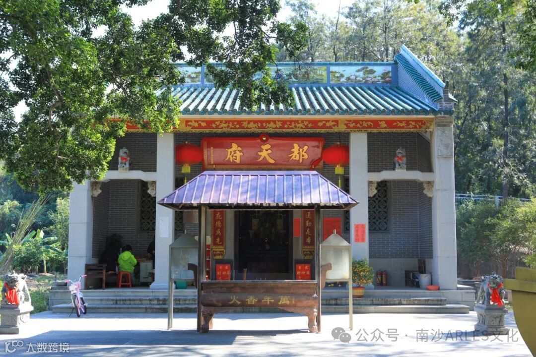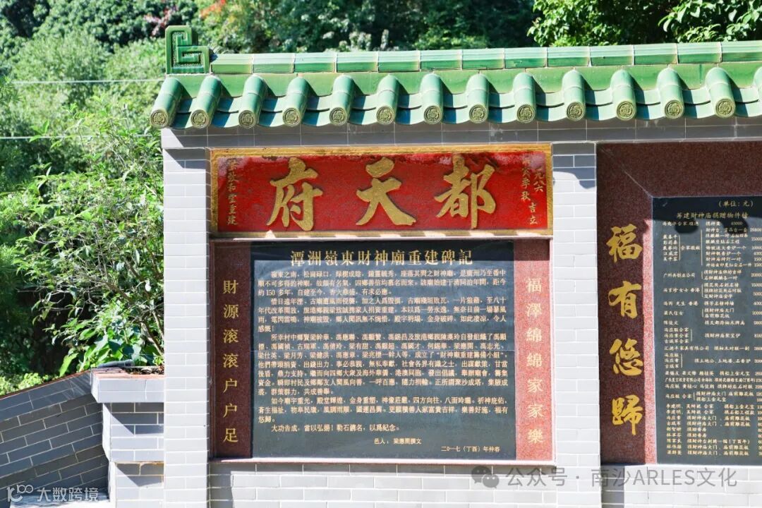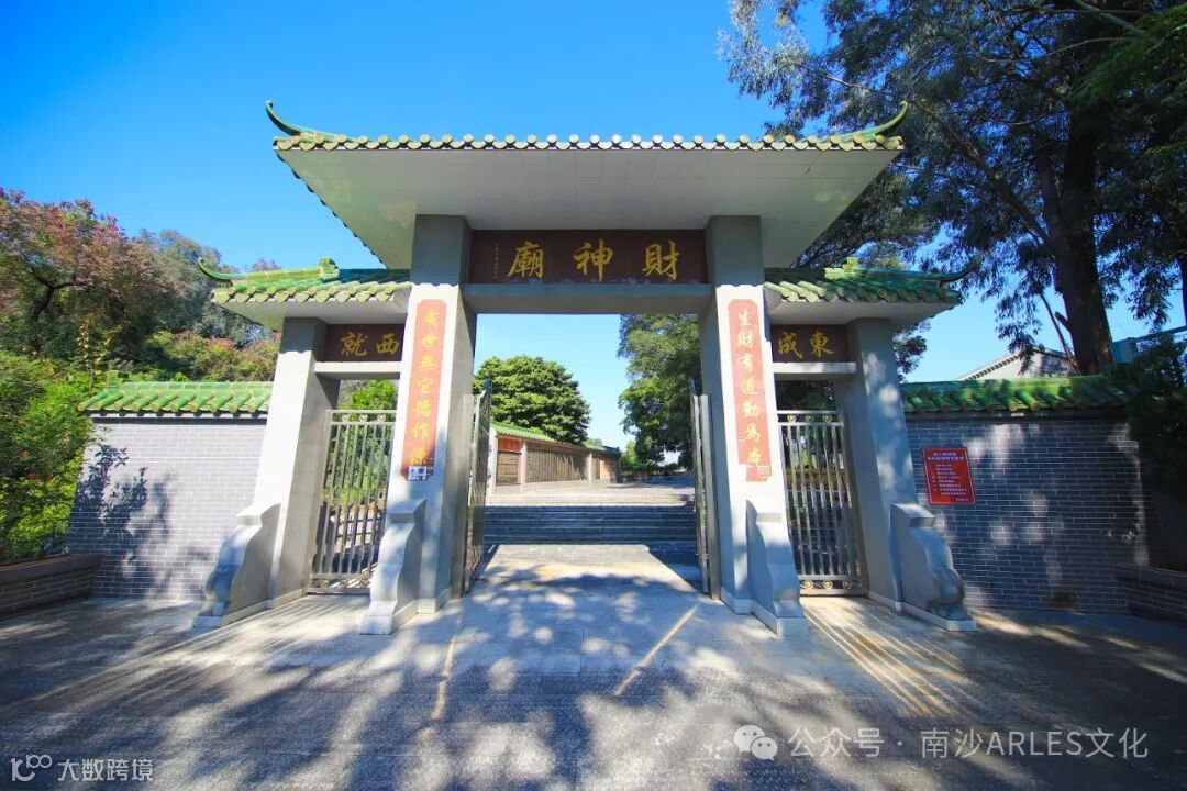 财神庙位于广州南沙区岭东村十八罗汉山山脚下,与潭山小学毗邻,重建后的财神庙占地面积2000平方米,主庙面积120平方米。主庙门框上方写有“都天府”3个大字,其上绘有“三星拱照”的壁画。整个庙宇只有一个门,门框上方写有“都天府”3个大字,左右写有“财运亨通勤是本,神恩广庇德为先”的对联,在“都天府”3个字的上面绘有“三星拱照”的壁画。走进里面的厅堂,迎面就是供奉的财神爷像,财神像是木雕的,连供台一起约有2米高,财神爷的左右摆有两个散财童子,财神爷的面前亦摆有一个香案,上面点有两盏长明灯及一个插满鲜花的花瓶,庙宇的左右墙壁上挂有好几套财神爷所穿的服装。财神庙始建于清同治年间,是原来番禺地区众多庙宇中唯一供奉财神爷的神庙。在1985年复建,香火鼎盛,周边群众都会来这里烧香拜财神。