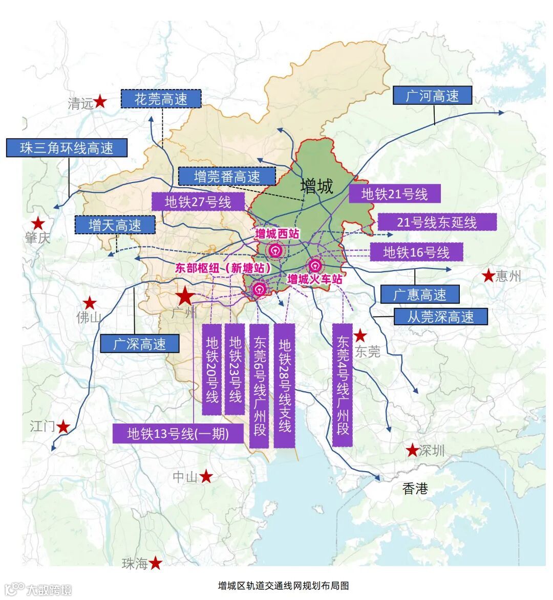 增城规划巩固广州东部门户枢纽地位,建设广州东部枢纽中心,构建辐射湾区东部主要城市,快速联系广州市中心和周边重要交通枢纽的对外交通系统,打造增城区“306090”交通圈,全面融入大湾区“1小时生活圈”和全球“12小时交通圈”。强化中南部组团、北部组团间的交通联系纽带,建设产业人才高效转移、城乡要素顺畅流动的综合交通基础设施网络。