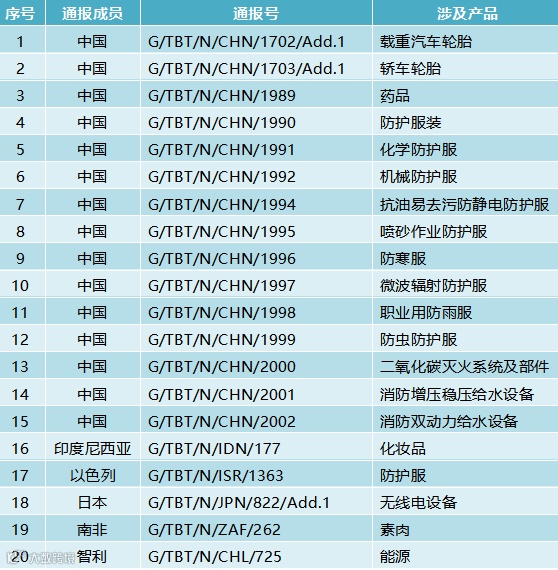 2025年2月27日,共有6个WTO成员通报了20项技术性贸易措施,均为TBT措施。通报情况为:中国15项、印度尼西亚1项、以色列1项、日本1项、南非1项、智利1项。这些措施涉及载重汽车轮胎,轿车轮胎,防寒服,消防双动力给水设备,化妆品,无线电设备,素肉,能源等。通报详情如表1所示。