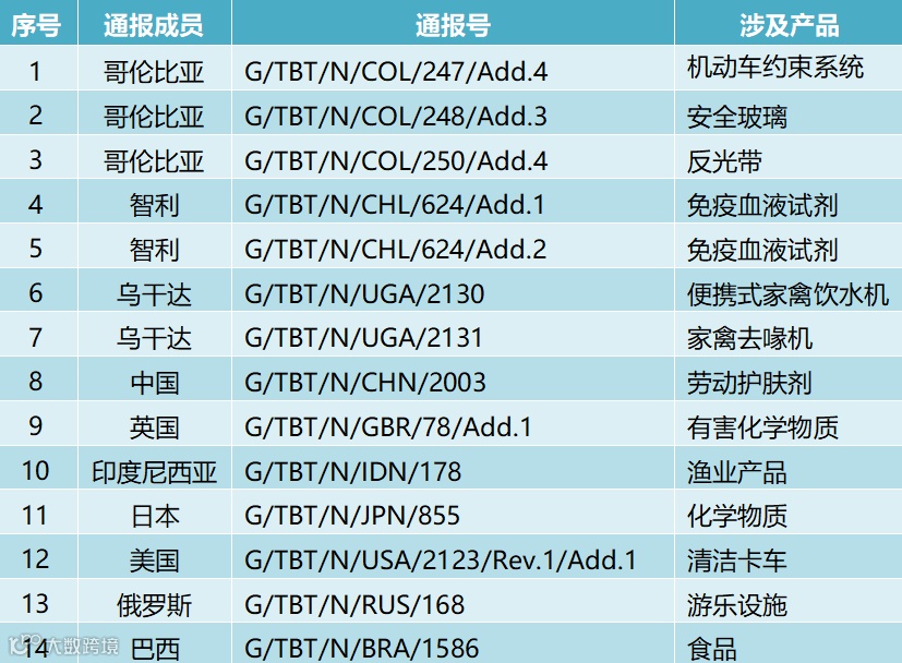 3月3日,共有10个WTO成员通报了14项技术性贸易措施,全部为TBT措施。通报情况为:哥伦比亚3项、智利2项、乌干达2项、中国1项、英国1项、印度尼西亚1项、日本1项、美国1项、俄罗斯1项、巴西1项。这些措施涉及机动车约束系统,安全玻璃,反光带,免疫血液试剂,便携式家禽饮水机,劳动护肤剂,有害化学物质,渔业产品,清洁卡车,游乐设施,食品等。通报详情如表3所示。