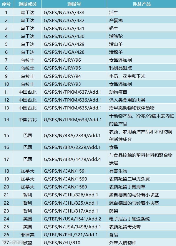 2月28日,共有9个WTO成员通报了27项技术性贸易措施,其中2项为TBT措施,25项为SPS措施。通报情况为:乌干达6项、乌拉圭4项、中国台北4项、巴西3项、加拿大3项、智利3项、美国2项、菲律宾1项、欧盟1项。这些措施涉及活牛,产蛋鸡,奶牛,活骆驼,食品添加剂,乳制品甜点,动物疫苗,供人类食用的肉类,活甲壳动物和软体动物,鳄梨,外来入侵物种等。通报详情如表2所示。