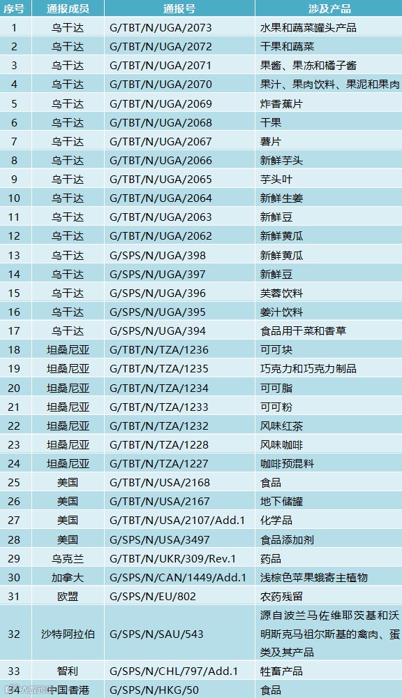 2024年12月16日,共有9个WTO成员通报了34项技术性贸易措施,其中23项为TBT措施,11项为SPS措施。通报情况为:乌干达17项、坦桑尼亚7项、美国4项、乌克兰1项、加拿大1项、欧盟1项、沙特阿拉伯1项、智利1项、中国香港1项。这些措施涉及水果和蔬菜罐头产品,炸香蕉片,干果,薯片,新鲜生姜,可可脂,风味红茶,咖啡预混料,食品,地下储罐,化学品,食品添加剂,药品,农药残留,牲畜产品等。通报详情如表所示。