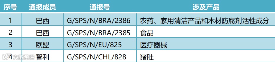 2025年3月7日,共有3个WTO成员通报了4项技术性贸易措施,全部为SPS措施。通报情况为:巴西2项、欧盟1项、智利1项。这些措施涉及农药、家用清洁产品和木材防腐剂活性成分,食品,医疗器械,猪肚。通报详情如表1所示。