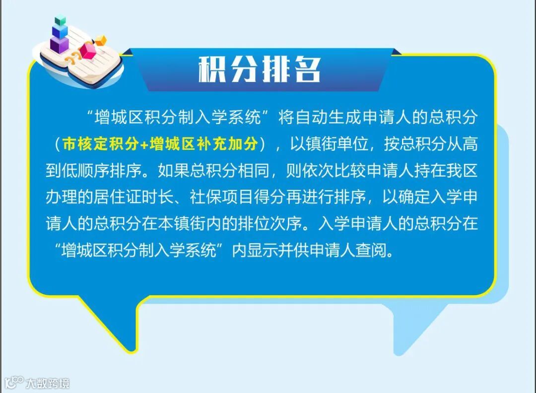 申请人的积分以镇(街)为单位进行排名,按积分分值高低进行排序。分数相同时,则依次比较申请人持在我区办理的居住证时长、社保项目得分再进行排序,以确定入学申请人的总积分在本镇街内的排位次序。达到镇街入围资格线的,可以获得统筹安排到义务教育阶段公办学校学位的资格。