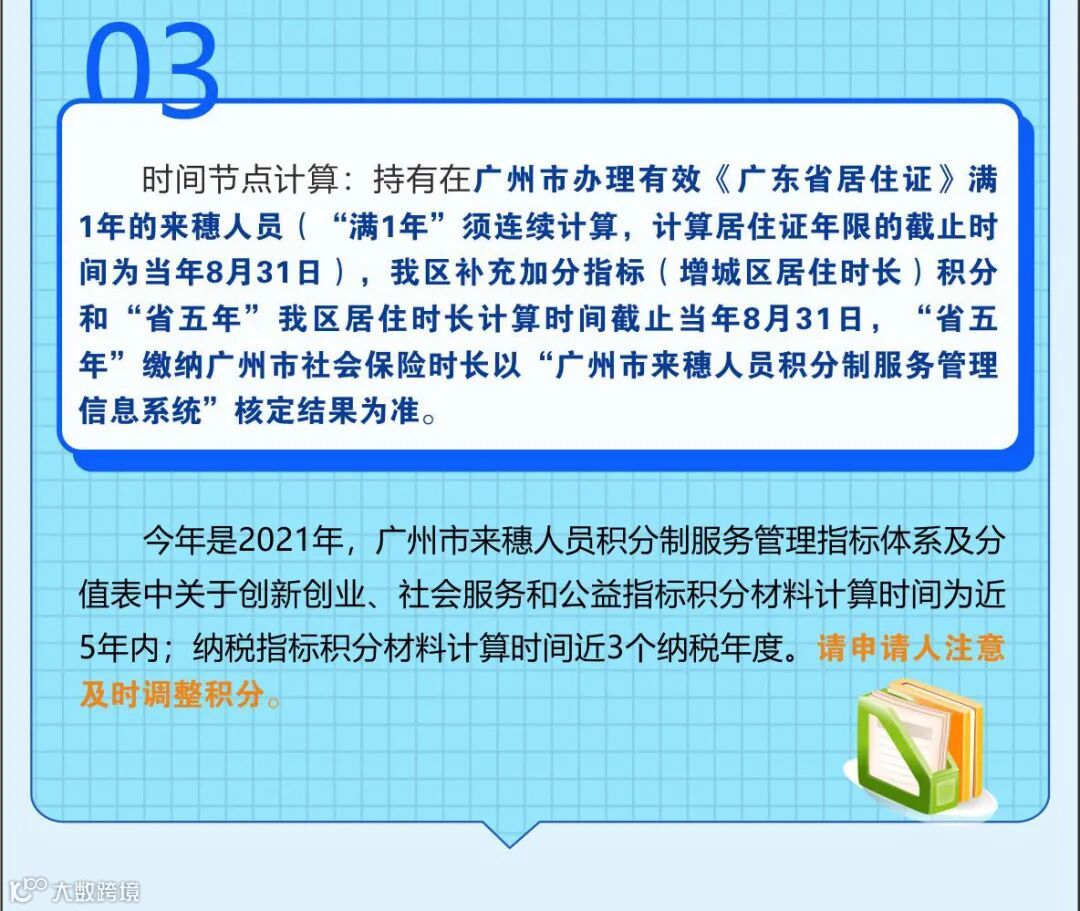 持有在广州市办理有效《广东省居住证》满1年的来穗人员(“满1年”须连续计算,计算居住证年限的截止时间为当年8月31日);我区补充加分指标(增城区居住时长)积分计算时间截至当年8月31日。广州市来穗人员积分制服务管理指标体系及分值表中关于创新创业、社会服务和公益指标积分材料计算时间为近5年内;纳税指标积分材料计算时间为近3个纳税年度(如2021年申请或调整积分,计算时间为2018年1月1日至2020年12月31日)。特别提示,信息系统将自动调整申请人的年龄和居住证的积分,无需申请人提出积分调整。
