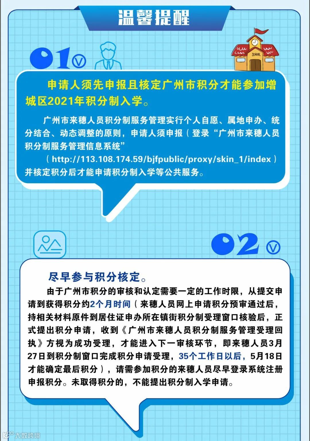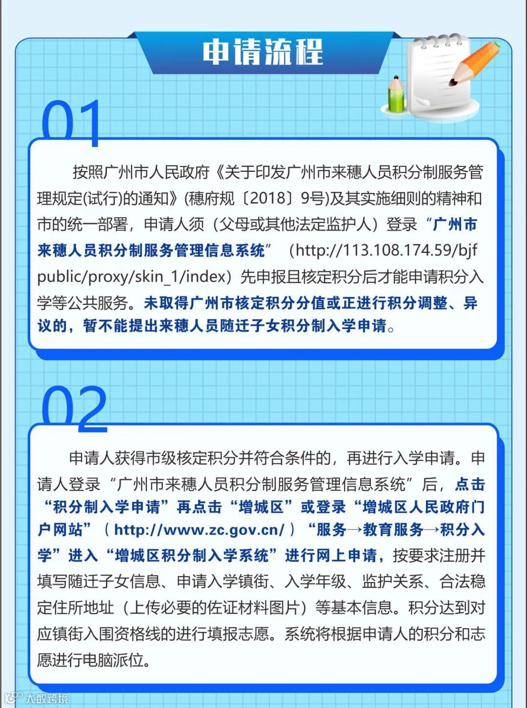 增城区来穗人员随迁子女申请积分制入学,由 “广州市来穗人员积分制服务管理信息系统”核定积分和增城区补充加分指标项目积分构成。