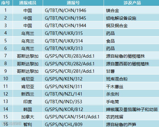 2024年11月13日,共有9个WTO成员通报了16项技术性贸易措施,其中8项为TBT措施,8项为SPS措施。通报情况为:中国3项、乌克兰3项、哥斯达黎加3项、肯尼亚2项、新西兰1项、印度1项、韩国1项、加拿大1项、智利1项。这些措施涉及镁合金,铝电解设备设施,铜及铜合金,药品,食品,杀虫剂,手电筒等。通报详情如表所示。