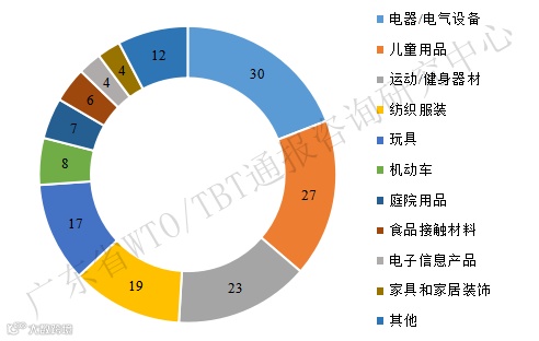 中国输美产品被召回最多的产品为电器/电气设备(19.1%)、儿童用品(17.2%)和运动/健身器材(14.6%)(见表2、图3)。