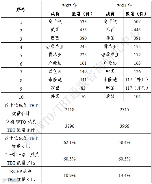 2022年(1月1日至12月31日,下同),世界贸易组织(WTO)的164个成员中共有84个成员提交了3896件TBT通报¹,其中包括2298件新通报、1552件补遗和勘误通报、46件修订通报。提交通报数量位列前10位的成员依次是:乌干达、美国、巴西、坦桑尼亚、肯尼亚、卢旺达、以色列、布隆迪、欧盟、韩国(见表1)。