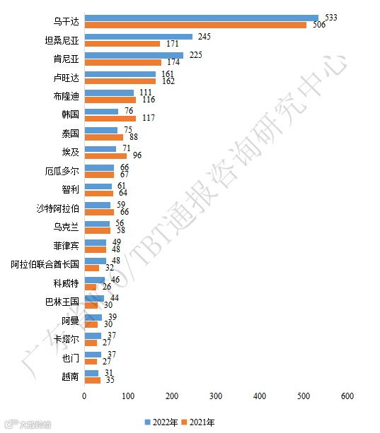 2022年提交TBT通报数量前10的成员以发展中经济体为主,具体国家总体变化仍不大。前10位中,80%的成员为发展中经济体,集中在非洲地区。其中,乌干达提交的TBT通报最多(533件),较上年增长5.1%,另外TBT提交数增长较多的还有坦桑尼亚、肯尼亚和美国,分别为42.4%、28.6%和16.4%;巴西、欧盟和韩国提交的TBT通报数与上年相比则分别下降14.2%、20.2%和35%;其他国家如卢旺达、布隆迪等提交的TBT通报数同比变化则不大;以色列则为新进入前十的国家,排名第7。