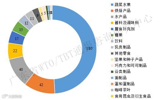 在农食产品方面,美国FDA通报拒绝进口农食产品3616批次,同比增加38.8%。中国输美农食产品被拒绝进口通报367批次,同比增加31.5%,占美国FDA通报农食产品总数的10.1%,占比较上年同期下降0.6个百分点。被拒绝进口的农食产品中以蔬菜水果和烘焙产品居多(见表5、图6)。