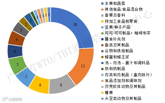 在农食产品方面,欧盟RASFF通报中国最多的类别是“水果和蔬菜”以及“其他食品/食品混合物”,这两类产品的通报数分别占中国农食产品被通报数的24.0%和16.0%(见表6、图7)。