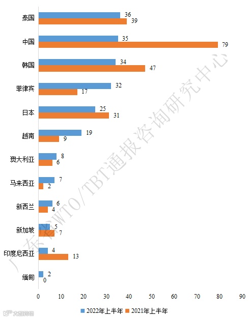《区域全面经济伙伴关系协定》(RCEP)³成员2022年上半年共提交了213件TBT通报,同比下降16.1%。泰国、中国、韩国和菲律宾提交的TBT通报数较多,均超过30件,共占RCEP成员总提交通报量的64.3%。相对而言,澳大利亚、马来西亚、新西兰、新加坡、印度尼西亚和缅甸提交的TBT通报数量较少。文莱、柬埔寨、老挝上半年并未提交TBT通报(见图2)。