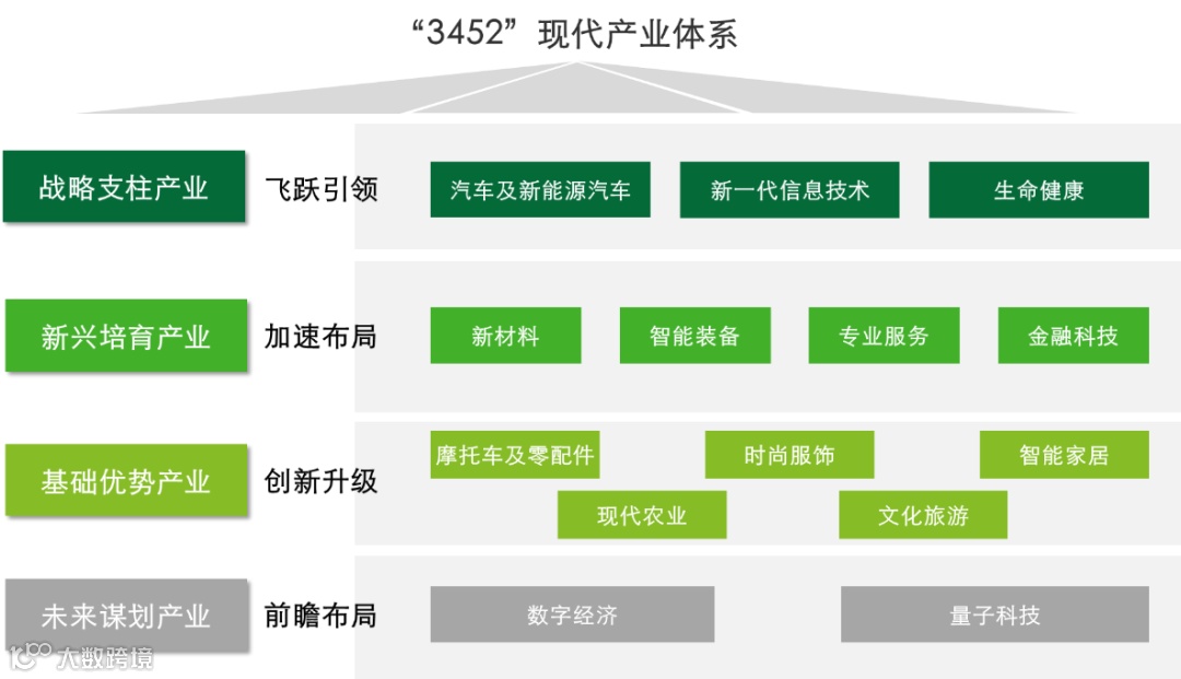促进摩托车及零配件、时尚服饰、智能家居、现代农业、文化旅游五大基础优势产业升级;前瞻谋划数字经济、量子科技等两大未来产业。